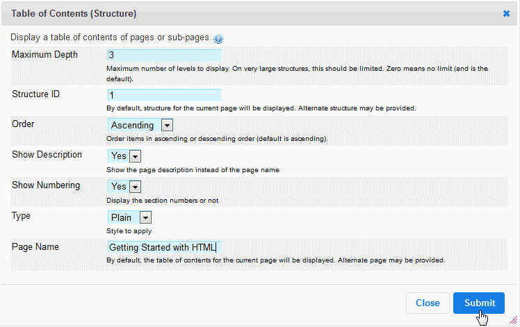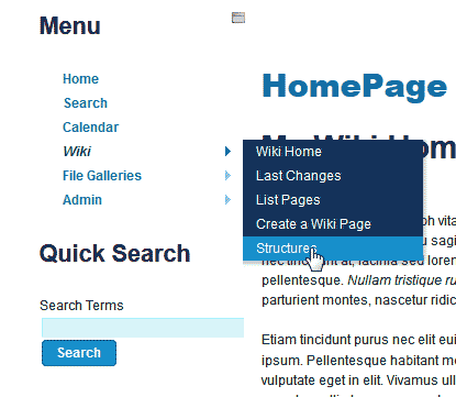 Creating structures or table of contents in TikiWiki Updated on August 16, 2021 by InMotion Hosting Contributor 2 Minutes, 8 Seconds to Read The previous tutorial explained how to create pages in TikiWiki. In TikiWiki, pages can be organized into categories that make the subject easier to navigate. These categories in TikiWiki are called Structures. This allows the writer of the page to create multiple pages related to one subject. This is a fast and user friendly way of organizing your TikiWiki content. This is similar to creating a book in that the structure is like a table of contents and the pages and sub pages are the content to the subject. Next we will create a structure in TikiWiki. Creating a Structure in TikiWiki In Tiki 9, Structures are enabled so you can create them by default. The following will explain how to make a tree style structure with pages and sub-pages in TikiWIki. Log into TikiWiki. On left side, hover over “Wiki” and select “Structures“ from the menu. Select the “Create New Structure” tab. Here is where you will create the structure. Enter the Structure ID and the alias for the structure, The tree is optional. You can leave that blank if you want. Click Create New Structure. You should see a Feedback box saying the Structure was created. Click the magnifying glass icon to view the new structure. The Structure will display nothing but an empty table of contents. To set the structure properties, click the puzzle and pencil icon. Here you can set the Structure of the Table of contents. Change the settings to reflect the type of tree you want to create. In this case we we did the following: – set the max depth to 3 – give the structure an ID of 1 – Made the order ascending – Show description yes – Show Numbering yes – Type is plain – Page Name Getting Started with HTML Click Submit. Now you will be back to the main structure page. Add a page to the structure. You can add as many pages to the main structure you like. Next, Select one of the pages that you added to the structure. You can add pages to that page to create a sub page related to that page. (This will be clearer once you add the sub page to page.) When done, you will have a tree style navigation with your topics in sub pages for easy navigation. See the image to the right. TikiWiki will automatically make a top navigation for the structure like the snapshot to the right. This concludes the tutorial on creatung stuctures in TikiWiki. Next, we will discuss how to format the content in TikiWIki. Share this Article Related Articles TikiWiki Overview How to change and upload a theme for TikiWiki Changing theme preferences in TikiWiki Installing TikiWiki manually Installing TikiWiki through Softaculous Logging into TikiWiki User Administration in TikiWiki Creating and editing pages in TikiWiki How to change the TikiWiIki logo How to upgrade TikiWiki from 9.2 to 9.3