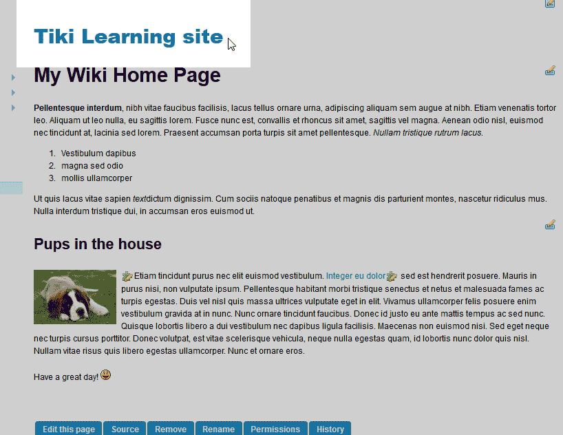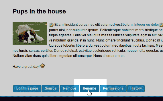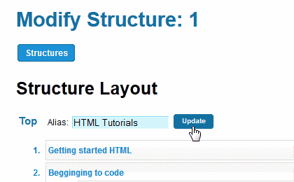 Renaming pages and Structures in TikiWiki Updated on August 16, 2021 by InMotion Hosting Contributor 1 Minutes, 37 Seconds to Read As time goes on with your TikiWiki site, some pages may need to be renamed to better represent your wiki information. “Pages” and “Structures” are the basis of your TikiWiki site structure. The following sections will explain how to rename the pages and structures in TikiWiki. Note! The page name is a part of the URL. For example: https://your-tiki.com/tiki-index.php?page=My+TikiWiki+learning+site The “My+TikiWiki+learning+site” part of the URL is the page name in TikiWiki. If anyone visits the old url, they will get a page not found. TikiWiki will not set up redirects on pages that are renamed. To have the old page redirect to the new page name, you will need to set up a redirect in TikiWiki. Renaming pages in TikiWiki Renaming pages is different than renaming structures in that the page has a rename button at the bottom of the page. The snapshot to the right shows an undesirable page name of “HomePage“. The following will explain how to rename a page. Log into TikiWiki. Find the page you want to rename. Click the Rename button towards the bottom of the page. On the rename page: screen, type your new page name. Click Rename. Now when you visit the page the Name will be your new name. Renaming Structures in TikiWiki Different than pages, structures have to be renamed through the Structures section in the TikiWiki admin. The following steps will explain how to rename a structure. Log into TikiWiki. Hover over Wiki and click Structures. On the Structures page, Select the structure you want to rename. In this case the name is “html_tutorial“. See image to the right. Next the “Modify Structure” page will have the option to change the Alias. The Alias is actually the structure name. Enter the new structure name and click Update. Now Your structure will have a new title on the page. See image to the right. Share this Article Related Articles TikiWiki Overview How to change and upload a theme for TikiWiki Changing theme preferences in TikiWiki Installing TikiWiki manually Installing TikiWiki through Softaculous Logging into TikiWiki User Administration in TikiWiki Creating and editing pages in TikiWiki How to change the TikiWiIki logo How to upgrade TikiWiki from 9.2 to 9.3