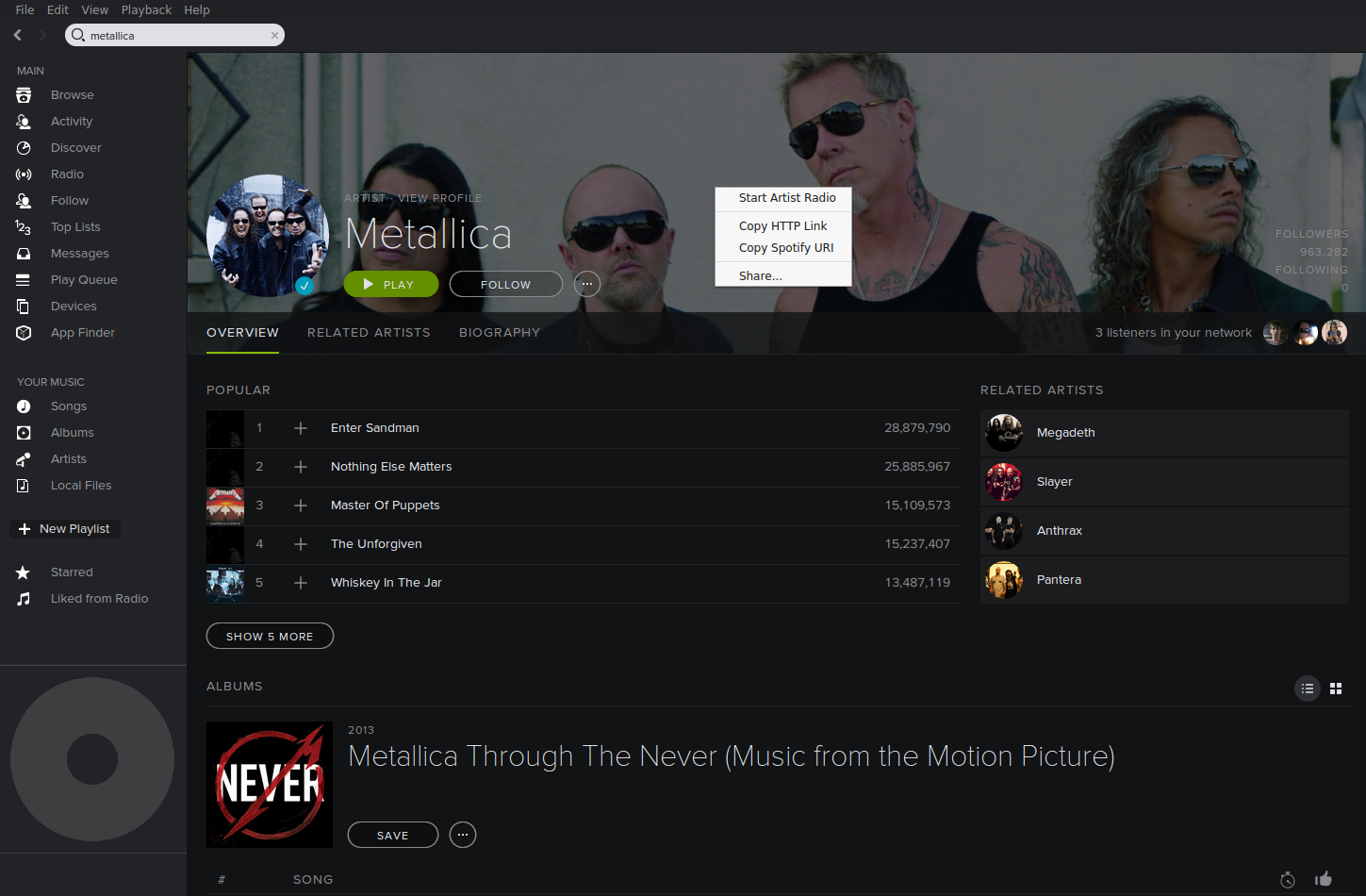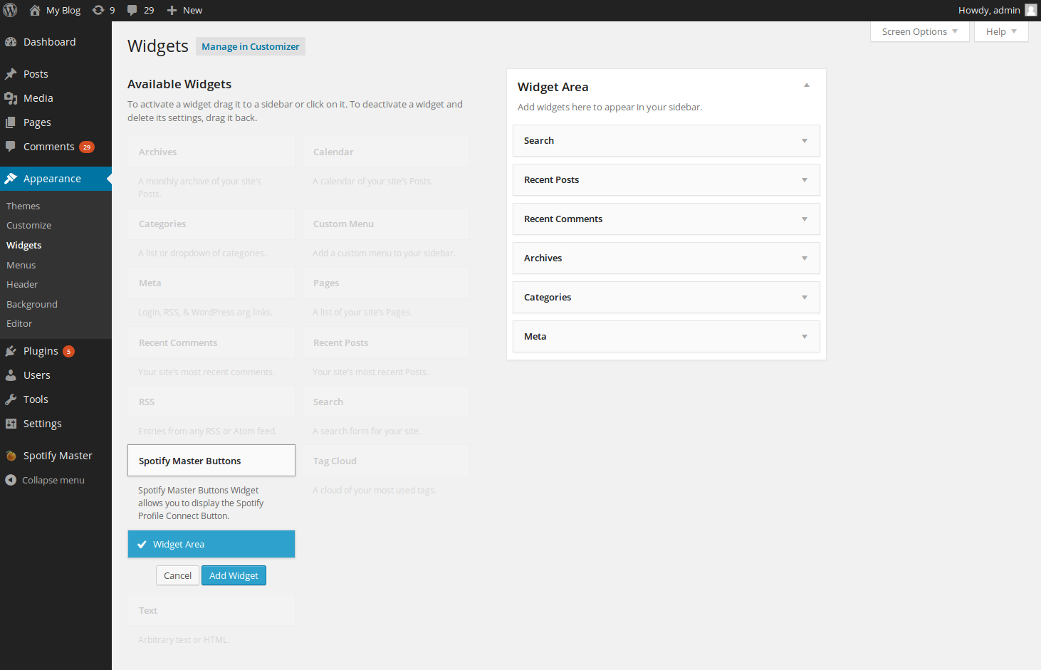 Adding a Spotify widget to WordPress with the Spotify Master Plugin Updated on June 8, 2023 by Jeff Matson 2 Minutes, 3 Seconds to Read If you are a musician, you are certainly familiar with the streaming music service, Spotify and likely would want to promote your music on there. In this article, we will show you how to embed a link your Spotify profile into WordPress using the Spotify Master plugin. Installing the Spotify Master widget First, log into your WordPress admin dashboard. Once logged into WordPress, hover over Plugins on the left side menu, and click on Add New. On the top right of the page, you will notice a search box labeled Search Plugins. Click on it, enter Spotify Master and press the Enter key on your keyboard to search. You should now be presented with your search results. To begin the installation, click on Install Now next to the Spotify Master result. WordPress will now automatically handle the download and installation of the Spotify Master plugin. Be sure to click Activate Plugin> to activate it. Displaying the Spotify Master widget Begin by navigating to your widget configuration in WordPress. To do so, hover over Appearance and click on Widgets. Below the Available Widgets section, you should now see a widget labeled Spotify Master Buttons. Click on it, select your desired widget area (if you have multiple widget areas), and click on the Add Widget button. The Spotify Master widget will now be listed within your widget area. If the settings are not already opened, click on the listen to open them. To show Spotify details, select the checkbox labeled Spotify Profile Button. You will now need to obtain the Spotify Profile URI. To do so, first open the Spotify desktop application and navigate to the artist that you want to display information on. In this example, we will be using Metallica as you see in the screenshot to the right. Next, right-click within the window and click on Copy Spotify URI. Now that you have your Spotify URI, jump back over to your widget configuration and paste it into the Insert Spotify Profile URI field. Of course, there are various other settings such as the theme of the widget, but we will only focus on making the widget functional. Once you make the changes that you want, click on the Savebutton. Now that you have installed and configured the Spotify Master widget, you should now see it within the widget area. In this example, we have placed widget linking to Metallica’s Spotify page within the widget area of the Twenty Fifteen theme. Share this Article Related Articles How to Create an Admin Account in WordPress via MySQL Create a Footer for WordPress How to Create a Gallery in WordPress without a Plugin How to Disable the WP-Cron (wp-cron.php) in WordPress How to Change Your Site URL in Your WordPress Admin Dashboard W3 Total Cache – Guide to WordPress Caching WordPress – Changing the Site URL and Home Settings How to Globally Change the Font in WordPress How to Install WordPress using Softaculous Cleaning Up Old Post Metadata in WordPress