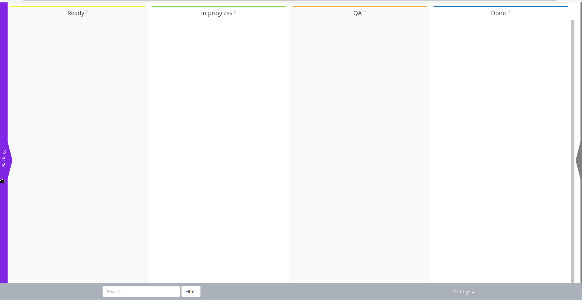Your kanban board will show your lists, or statuses (Ready, Done, etc.), and an example task. Arrows on the center left or right allow you to view lists not currently shown. Alternatively, select Settings at the bottom, then Show all columns.