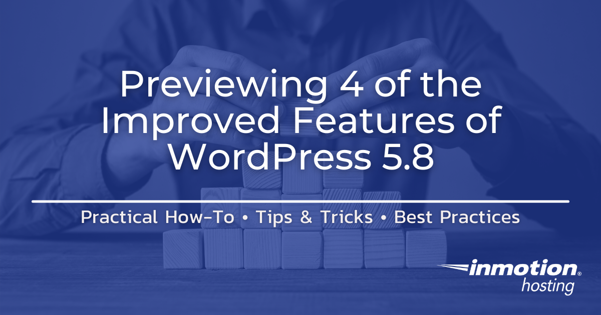WordPress 5.8 Previewing Four Improved Features Posted on July 1, 2021 by InMotion Hosting Contributor 6 Minutes, 17 Seconds to Read Previewing 4 Improved Features of WordPress 5.8 The upcoming WordPress 5.8 version continues to evolve its interface with improvements to its content and work interface. The development focus has been to mature the Gutenberg editor – the visual editor for posts and pages – into a more complete and competent tool that retains its ease of use while adding to its functionality. We check out 4 of the newly improved features of WordPress 5.8 so that we can show where these features exist and how they work. The features of the visual editor that we’re covering in this article include: Improved Features – Color OptionsParagraph Color OptionsTable Color OptionsImage Duotone OptionsDark ModeAdded Spacing options – Line HeightDrag-and-drop Cover Block FunctionalityEmbedding PDFs with the File Block We will describe and provide some screenshots and short videos to show the new features. Note that these tests utilize the nightly beta release of WordPress 5.8, so some features may appear different or work differently in the final release. For the most secure WordPress site, you need secure hosting. That’s why InMotion Hosting crafted WordPress Hosting with rigorous server-side security - so you can spend less time hardening your hosting and more time creating your website. WordPress Hosting Plans Improved Features – Color Options Color options have improved in several areas. Depending on the theme, you will see more options for color in posts and pages. Tables can now use gradient backgrounds and images can be set to duotone. On the front end, the customization features now support Dark Mode. Paragraph Color Options The following screenshots start with the paragraph color options in WordPress 5.7.2 followed by the current 5.8 betas. The second screen capture is in dark mode, but the themes being used in both are the same. The themes can affect the color options available to you. WordPress 5.7 paragraph block color options WordPress 5.8 paragraph block color options The new color options in WordPress 5.8 include the option to change the color of the links. At this point, the color selection interface remains the same. You can also select custom colors in both versions using hexadecimal, RGB, or HSL values. Additionally, the color of the text will still automatically change depending on its background color as long as you have not changed the default color of the text. This was done to ensure readability and continues to be an included feature. Table Color Options Another improved feature is the addition of the option to add a gradient and make adjustments to the gradient is available for added tables. You can also change the gradient type from linear to radial with the drop-down menu. WordPress 5.7.2 Table Options WordPress 5.7 Table block color options WordPress 5.8 Table Options WordPress 5.8 table block color -gradient option Note the interface includes a solid color option and the option to make adjustments to the gradient. It also includes an option to change the direction of how the gradient appears. Image Duotone Options Images can be set to use duotone colors. Currently, the option can be used where you can select the image. I tested this in several blocks and it was most consistent in the Image block and cover block. The option for duotone is accessed through a dotted circle icon in the image block toolbar. There are multiple image blocks where this feature is not currently working.Duotone colors set a color for highlights and another for shadows. This screenshot will show you where the option can be accessed: WordPress 5.8 Image block – duotone option in toolbar Here you can see how image appears with duotone applied using the colors of blue and red. WordPress 5.8 image block – duotone applied As of the writing of this article, the slide bars to adjust the duotone colors do not work. You can choose a custom color and adjust the colors there. This will help to improve the sharpness and bring out features lost in the shadow color. The duotone option is also available in the cover block where images can be selected. It does not work in the gallery block. However, remember that these are beta versions, so these issues may be addressed in future releases. Dark Mode The other color option that has been added to WordPress 5.8 is the option to support dark mode. Dark mode is simply an option to use darker colors overall on computer screens. This is often changed dynamically depending on the time of day or as a user option. Dark mode is also appearing in many applications like internet browsers where users spend a lot of time looking at screens. Enabling Dark Mode Login to the front end of your WordPress site as an administrator. Or, you can log in to the WordPress Administrator dashboard, click on the link to your site in the top left corner, then click on the menu option that is labeled Customize.In the menu, click on Colors & Dark Mode.Check the box labeled Dark Mode support.Save your change by publishing the site or saving the draft. When Dark Mode is set, you will see the option appear in the bottom right corner of the site when you view the front of your WordPress site with the customize option. You can click on it to turn it off or no. WordPress 5.8 – Dark Mode off WordPress 5.8 Dark Mode on Added Spacing Options – Line Height If you’re new to WordPress, then you might be surprised when you’re typing a sentence or two in a post/page and hit enter. The default height (depending on the theme) is typically 1.5 and 1.0 when you hold down the shift key. It can be a little disconcerting at first. WordPress 5.8 allows you to have multiple heights depending on the text block that you’re working in. Here you can see the new feature in action here: Note that the text is being adjusted in the column. You can have multiple blocks of text with diff