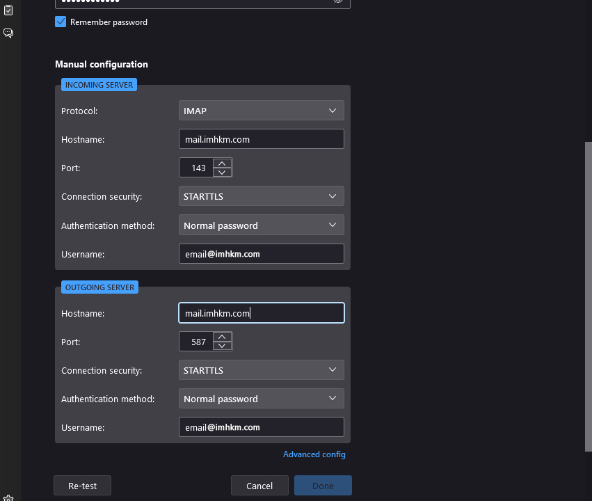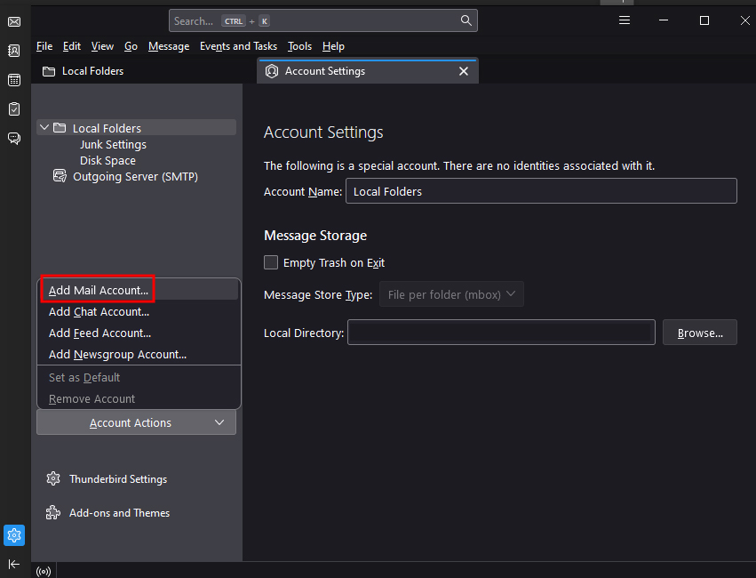 Checking an Email Account in Thunderbird Updated on June 4, 2024 by Brad Markle 2 Minutes, 29 Seconds to Read This article teaches you all about checking an email account in Thunderbird. We will only need to create a mailbox in Thunderbird. Below are the step by step instructions. You will need your email settings to complete this guide. You can view your email settings in cPanel at any time. How to create a new account in Thunderbird Open up your Thunderbird email client onto your desktop On your Thunderbird Home page, you’ll see an “Account Settings” option at the top right (Clicking email under Set up Another Account will do the same thing.) You’ll see an “Account Actions” drop down button on the left of the “Account Settings” page. Click that and then click “Add Mail Account.” You’ll enter your email account information on the following screen Thunderbird will now try and find standard connection information to connect the email account. While this will work most of the time, you may need to configure this information yourself by clicking the Configure Manually button found at the bottom. Be sure to select the incoming protocol you wish to use (IMAP or POP3). You can read about the differences here. Generally speaking, IMAP is best if you plan on checking the email from multiple devices. This is the manual configuration page, where you will set up the incoming and outgoing servers and their respective ports. Once you have entered your settings, hit the Re-test button. If the settings are correct, the Done button will become available. Click it to move on to the next step. Server Hostname You will need to know the servername to the email company you are using. InMotion servers use mail.servername.com. Others may use imap.mail.servername.com or pop.mail.servername.com, which are fairly standard. Port Port number will change depending on your IMAP/POP choice as well as your SSL choice. Use the table below to determine which port number to use. Incoming Ports IMAP 143 IMAP with SSL 993 POP3 110 POP3 with SSL 995 Outgoing (SMTP) Ports Regular (Non-SSL) 25 or 587 SSL 465 SSL This is where you set your encryption settings. Autodetect Thunderbird will test different standard encryption and port settings. None Standard setup with no encryption STARTTLS Not used for InMotion Hosting Servers. SSL/TLS Standard encryption setting. Authentication Autodetect Thunderbird will test different standard encryption and port settings. Normal Password Use an unencrypted password (Recommended Setting.) Secure Password Use an encrypted password. Kerebros/GSSAPI Security Protocol not supported by InMotion Hosting servers. NTLM Microsoft security protocol. (Not supported by InMotion servers) If you did select the normal (unencrypted) settings, you will be presented with a popup telling you that the email connection to the server is unencrypted. You can check the I understand the risks checkbox and then click the Done button to continue. That should complete the process of adding an email address to the Thunderbird email client. You should now see your new email address in the left hand sidebar. That means it is ready for use! Share this Article Related Articles Set Up MX and SPF Records for InMotion Hosting Professional Email How to Purchase InMotion Hosting Professional Email in AMP How to Import Email Accounts and Forwarders into cPanel How to Configure Mailbox Quota Notifications How to Login to SquirrelMail SpamAssassin: Fighting Spam How to Fix the “550 No Such User Here” Email Error How to Setup an Email AutoResponder in cPanel Logging into Horde How to Change an Email Password in cPanel and Webmail