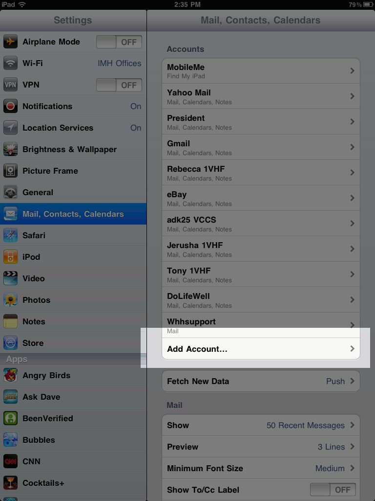 5. Under “Mail, Contacts, Calendars“, click “Add Account…