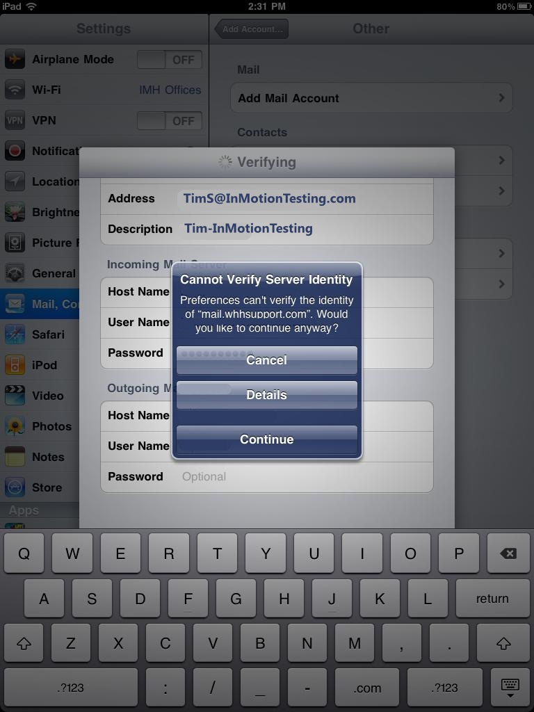 15. Your iPad will try to verify the SSL certificate for mail.domain.com. If you do not have an SSL installed on your domain it will likely fail since the SSL is issued to the server not your specific domain, but it is safe to click Continue.