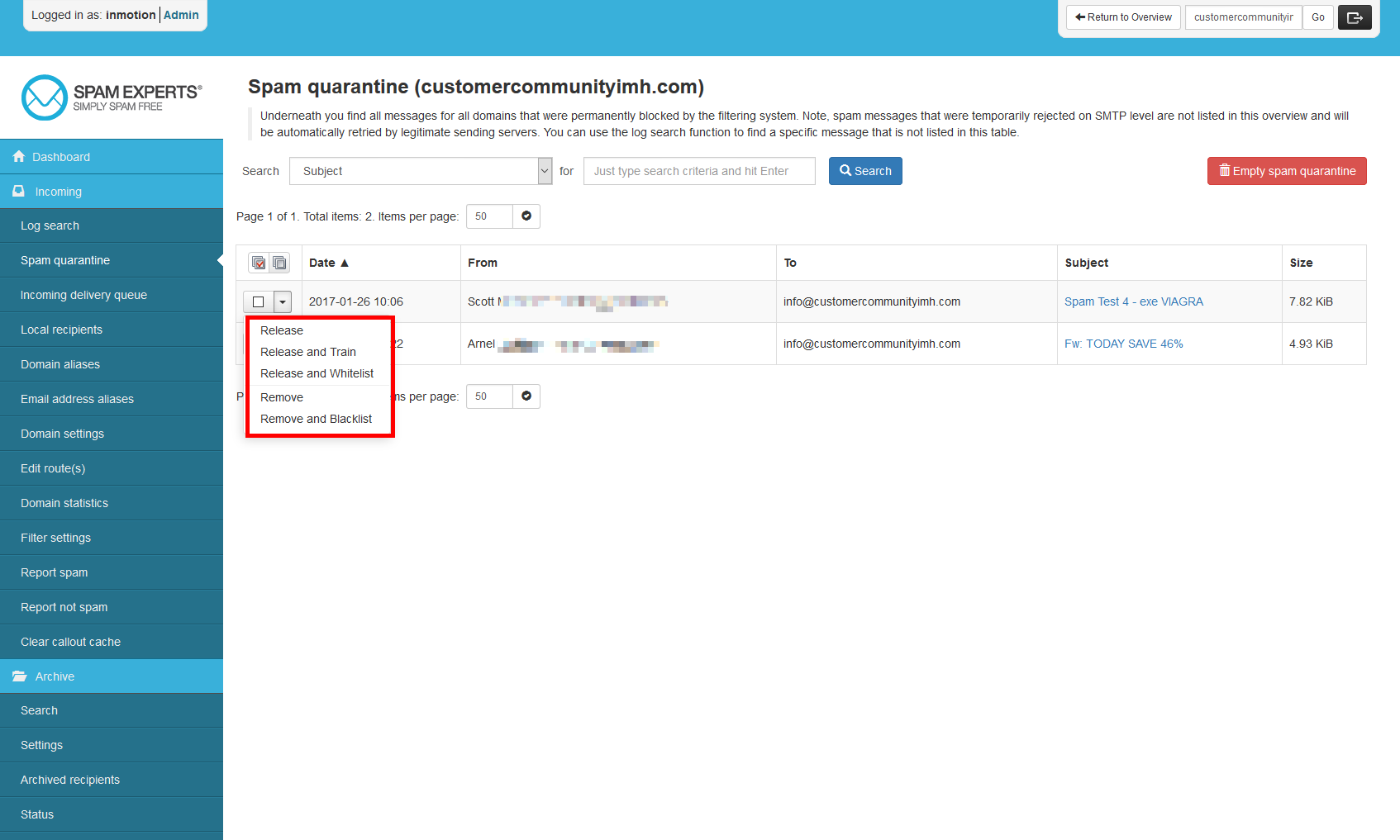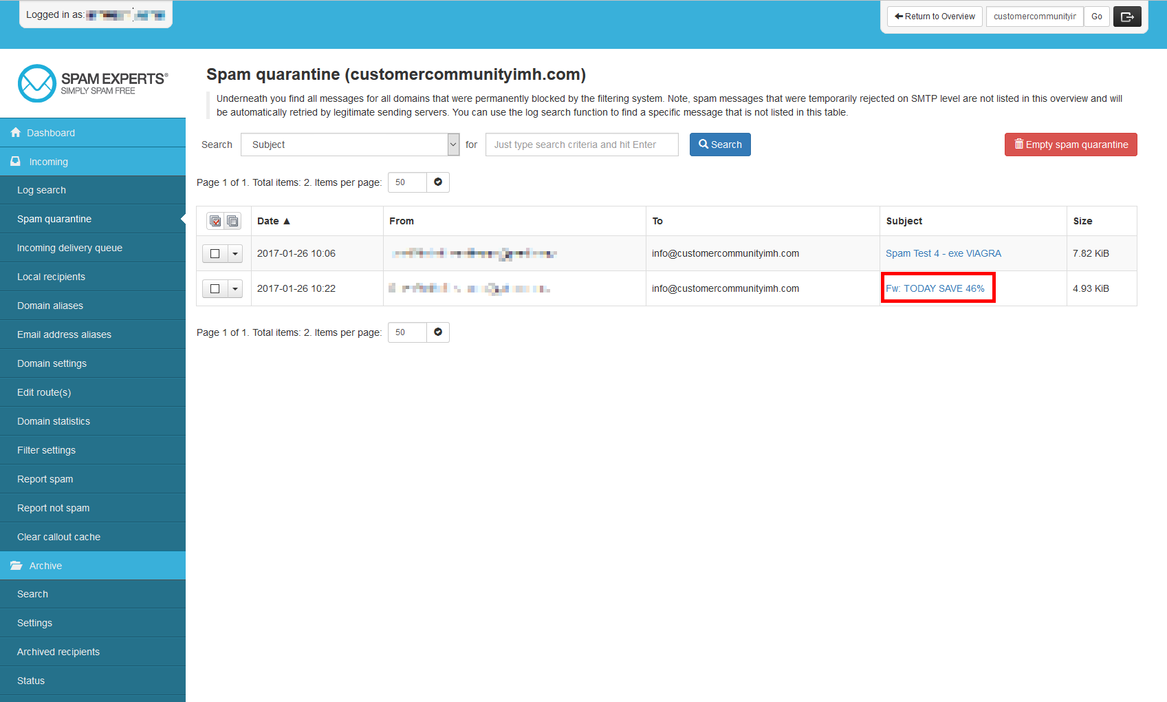How to use the Spam Experts Spam Quarantine Tool Updated on May 13, 2024 by Scott Mitchell 1 Minutes, 35 Seconds to Read When using Spam Experts as your spam filtering tool, any spam not specifically rejected by other rules will be sent to a quarantine section. You will be able to visit the quarantine list and decide how to deal with each individual email. Here we show you how to check the quarantine list and perform the various actions to help improve your spam prevention program. Viewing the Quarantine List Log into your SpamExperts admin dashboard. Click on the Spam quarantine icon. The quarantine list will display showing the current list of spam emails being held. Viewing a Quarantined Email Log into your SpamExperts interface. Click on the Spam quarantine icon. Click on the specific link in the Subject field to view the email. The entire email will display. You can view either the original email in text and HTML form, or the raw content complete with all the headers. Managing the Quarantined Emails Log into your SpamExperts dashboard. Click on the Spam quarantine icon. Click on the downward icon in the left hand column. You will be presented with several options. Select the best option for the email. Release Allow the selected email to go on to your Inbox. Release and Train Allows the selected email to continue to your Inbox, while telling SpamExperts it is not spam to help improve the system. Release and Whitelist Allows the selected email to continue to your Inbox while whitelisting the sender on your account. Remove Deletes the email from the list. Remove and Blacklist Deletes the email from the list while blacklisting the sender on your account. You will see a confirmation box advising you of your action. If you agree, click on the Apply button. Clearing the Quarantine List Log into your SpamExperts admin interface. Click on the Spam quarantine icon. Click on the Empty spam quarantine button. Now your quarantine list will be empty and ready to accept new spam. Share this Article Related Articles How to Log into Spam Experts How to Setup Your SpamExperts MX Records Spam Experts – Train Email as Spam How to use the Spam Experts Spam Quarantine Tool How to Create a Shortcut to the Spam Experts Login Train Spam Experts – Email Not Spam How to set an Email Size Limit in SpamExperts How to set Email Attachment Restrictions in SpamExperts How to Whitelist or Blacklist in SpamExperts How to Add an Email User in SpamExperts