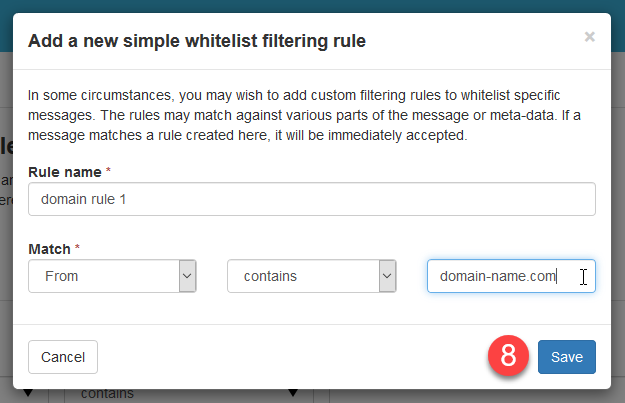 Whitelist a Domain in Spam Experts Updated on November 27, 2023 by InMotion Hosting Contributor 1 Minutes, 45 Seconds to Read In this article: Learn to Whitelist a Domain You may occasionally want to make sure that emails from a domain are never blocked by Spam Experts. The process of making this exemption is called whitelisting. You should only make exemptions when it’s necessary. Making too many exemptions will make Spam Experts ineffective at filtering spam from your email. Use this tutorial to learn how to whitelist a domain in Spam Experts. Check out InMotion’s Shared Hosting solutions for secure, high-performance servers that meet your budget needs. How to Whitelist a Domain With Spam Experts Follow the steps below to whitelist your domain. Click on the slideshow that follows to see the screenshots related to each step. Log into Spam Experts. Click on Whitelist Filtering Rules under Incoming – Protection Settings. Select + Add Rule at the top of the page. Name the rule that you are creating. For example, you may want to name it after the domain you’re whitelisting: Example.com whitelist rule. Since the rule you’re creating is based on the FROM field, click on the drop-down arrow under Match and then select “From“. In the next field click on the conditional that you want to use. Since any email from a particular domain would be something like “[email protected]“, you will want to use “contains“. This will allow you to include any email from that domain. Type in the domain name you’re trying to whitelist in the next field. Click on Save. Click on the arrow or dot to move through the screenshots in the slideshow below. The numbers correspond to the directions above. Congratulations! That completes our tutorial on whitelisting a domain! Spam Experts will exempt the domain name you have added in the rule that you have created from this point. Any rule that you add will appear in a list at the bottom of the page. Click on this link in order to see more Spam Experts tutorials. FOr the opposite problem, check out how to blacklist domains in Spam Experts. If you’re having trouble with outgoing email, see how to whitelist recipients in Spam Experts. Share this Article InMotion Hosting Contributor Content Writer InMotion Hosting contributors are highly knowledgeable individuals who create relevant content on new trends and troubleshooting techniques to help you achieve your online goals! More Articles by InMotion Hosting Related Articles How to Log into Spam Experts How to Setup Your SpamExperts MX Records Spam Experts – Train Email as Spam How to use the Spam Experts Spam Quarantine Tool How to Create a Shortcut to the Spam Experts Login Train Spam Experts – Email Not Spam How to set an Email Size Limit in SpamExperts How to set Email Attachment Restrictions in SpamExperts How to Whitelist or Blacklist in SpamExperts How to Add an Email User in SpamExperts
