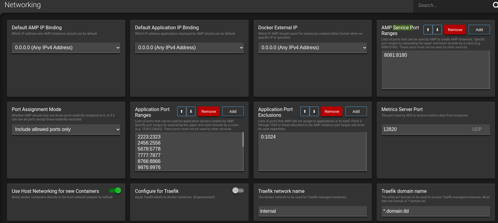 Access & Change Minecraft Networking Options Updated on September 6, 2023 by InMotion Hosting Contributor 3 Minutes, 3 Seconds to Read When you first purchase your Minecraft Server hosting account it will be set up and ready to work, but there may be times when you want to use custom networking options. For example, if you have multiple instances and are accessing them using the hostname, you can change the port for each instance to allow users to access them. Such as:vps91249.inmotionhosting.com:25565 vps91249.inmotionhosting.com:25564 In this guide, we’ll show you how to access and change the networking options for your Game Management Panel. Note: It is not recommended to modify these settings unless you are familiar with how they will affect your setup. Accessing Your Networking Options Changing Networking Options Default AMP IP Binding Default Application IP Binding AMP Service Port Ranges Change Service Port Range Priorities Removing a Service Port Range Add a Port Range Port Assignment Mode Application Port Ranges Application Port Exclusions Remote Instance Access Mode Accessing Your Networking Options Navigating to your networking configuration page is the first step in changing the setup of your server. After showing you how to access the networking options, we’ll go over the settings that can be changed. Login to your Game Management Panel. Click Configuration in the main menu, then Networking. You will then see the available Networking options. Changing Networking Options Now that you know how to access the networking options, we’ll explain what options are available and how to change them. Note: Changes will be saved immediately when you modify them. Default AMP IP Binding This section is where you set the IP address new instances will use by default. The available options should look similar to this: 0.0.0.0 (Any IPv4 Address) :: (Any IPv6 Address) ::1 (Loopback (IPv6)) 127.0.0.1 (Loopback (IPv4)) 123.456.78.910 (venet0:0) Default Application IP Binding Here you can select which IP address any applications that are deployed will automatically use. 127.0.0.1 (IPv4 Loopback) 123.456.78.910 (venet0:0) 0.0.0.0 (Any IPv4 Address) AMP Service Port Ranges In this section, you have the ability to add, remove or reorder the service port ranges used by your Game Management Panel when new instances are created. Change Service Port Range Priorities You can click the arrows to move the priority up and down. Removing a Service Port Range Click the Remove button to delete a port range immediately. Add a Port Range Depending on your setup, you have the ability to add additional port ranges. Click the Add button. Enter the beginning port range followed by a colon (:) Enter the ending port range. Click the OK button to save your changes Port Assignment Mode Here you can choose to use only ports that are allowed or any port unless it is specifically excluded. The allow/excluded ports are set in the Application Port Ranges and Application Port Exclusions sections that follow. Click the dropdown box and choose from the following options: Include allowed ports only Allow all except excluded Application Port Ranges Here you can reorder, remove or add port ranges for any application servers generated by your Game panel. Application Port Exclusions In this section, you can Add IP ranges that you do not want to allow to be used for applications. Ports 0 to 1024 are automatically added here since they are used by your Game Management Panel. For more information, see the section on how to reorder, remove or add port ranges. Remote Instance Access Mode Your Game Panel can communicate with your Minecraft server instances using several different methods. You can choose from the following options, check out the official documentation for more information. Via Target Direct from Controller Bypass Controller Congratulations, now you know how to access and change the network settings for your Game Management Panel. Share this Article IC InMotion Hosting Contributor Content Writer InMotion Hosting contributors are highly knowledgeable individuals who create relevant content on new trends and troubleshooting techniques to help you achieve your online goals! More Articles by InMotion Hosting Related Articles Minecraft Instance Configuration Options Using the Minecraft File Manager How to Schedule Triggers on Your Minecraft Server Setting Minecraft Instance Defaults Minecraft Server Instance Management Updating AMP in the Game Management Panel Using the Game Management Panel Console Game Management Panel Security and Privacy Options Managing Backups in the Game Management Panel Connecting to Your Minecraft Server with SFTP