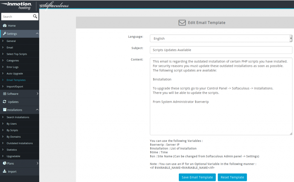 How to View Outdated Installations in Softaculous Updated on April 4, 2022 by InMotion Hosting Contributor 1 Minutes, 47 Seconds to Read Surveys ranking reasons websites get hacked almost always have the same thing listed as the #1 reason: outdated software.Sucuri.net Security, like customer service, is everyone’s responsibility. cPanel users can see the number of Outdated Installations on their Softaculous homepage. Meanwhile, VPS Hosting root users can use Web Host Manager (WHM) to check the entire server for outdated web apps. This only works on programs imported via sync or manually into Softaculous. Consider emailing all cPanel users about the security benefits of this process along with how to upgrade programs in Softaculous. This could also help you identify websites using outdated scripts in Softaculous which are more vulnerable to being hacked. Below we’ll cover how to view outdated installations in Softaculous and email cPanel users. View Outdated InstallationsEmail cPanel UsersEdit Email Template Note: VPS Hosting customers can purchase Softaculous in your Account Management Panel (AMP). View Outdated Installations Log in to WHM.Click Softaculous – Instant Installs on the left.Click Installations, then > Outdated Installations. The other options under Installations filter installed installations accordingly excluding Statistics.If you have a long list, you can filter the results at the top by script, user, domain. Remember to check the box to Show only outdated Installations.Click Search to update your results. Email cPanel Users Outdated installations may have been abandoned after testing a new function or creating a quick site for a friend. Remind all cPanel users with a few clicks. While on the Outdated Installations page, click the checkbox of an outdated installation and click Email users of newer versions to email the cPanel users. The emails will be sent to the Contact Email listed on the WHM List Accounts page. The default email will include the installation, installation URL domain, and steps to upgrade in Softaculous. Edit Email Template To customize the template for this email: In Softaculous – Instant Installs, Click Settings, then Email Templates.Click the edit icon to the right of Updates Available Template (From ADMIN).After editing the subject and content, click Save Email Template. Edit the email template to include info on updates, security, and backupsList of outdated installations in Softaculous Share this Article InMotion Hosting Contributor Content Writer InMotion Hosting contributors are highly knowledgeable individuals who create relevant content on new trends and troubleshooting techniques to help you achieve your online goals! More Articles by InMotion Hosting Related Articles How to enable Auto Upgrade feature in Softaculous Configuring Email Notifications within Softaculous How to Uninstall Software Using Softaculous List of Programs in Softaculous Instant Installer How to clone your site with Softaculous Do You Need Softaculous On Your Managed VPS / Dedicated Server? How to Change your Softaculous Theme in WHM How to Install Software Using Softaculous How to Install TomatoCart with Softaculous How to Import/Export Softaculous Settings in WHM