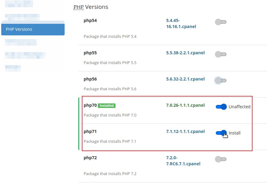 How to Install PHP Versions in EasyApache 4 Updated on August 15, 2023 by InMotion Hosting Contributor 2 Minutes, 15 Seconds to Read PHP 7.2 reached end of life (EOL) in January 2021 and PHP 8 is available now. The major changes of this new PHP version affect many of the most popular PHP-based content management systems (CMSs) and overall LAMP-stack server security as features have been heavily revised for better security and performance. It’s important to know how to maintain up-to-date PHP versions on your cPanel VPS or dedicated server with WebHost Manager (WHM). For a seamless transition and optimized performance, consider upgrading your PHP hosting to PHP 8 hosting. Below we cover how to: Ensure cPanel is Updated Install New PHP versions with EasyApache4 Ensure cPanel is Updated Before continuing to install PHP versions: Ensure cPanel is up to date. You can update cPanel via SSH or log into WHM as root to check for an update notification in the upper-right corner. Ensure EasyApache4 is installed by searching for it on the left side of WHM. If not, or you have EasyApache3 instead, install EasyApache4. Create a server snapshot in your Account Management Panel (AMP). Install PHP Versions with EasyApache4 Click to enlarge this screenshot image. Log into WHM as root. On the left, search for and select EasyApache4. At the top, select Customize to edit your current server configuration. On the left, select PHP Versions. Uninstalled PHP versions will have a gray slider on the right side. Installed PHP versions will have a blue slider. To install a new PHP version, select the slider for the new PHP version(s) you want to install so it turns blue.You should uninstall old PHP versions that have reached end-of-life (PHP 7.3 and older as of January 2021). However, before doing so, you must ensure the older PHP versions aren’t currently used by any web applications on your server before removing them. If you’re unsure about this, install the newest PHP version first. Then test all websites and applications in your server environment to ensure there are no compatibility issues. Afterwards, remove the older PHP version(s). Select Next to make further changes within EA4 until you reach the Review section. If you don’t need to make any other changes besides install PHP versions, simply select Review on the left. Review the pending changes. Once you’re sure of the changes you want to make, select Provision at the bottom. Select Done. Congratulations, now you know how to install PHP versions using EasyApache 4. Check out our guide if you are seeing the Fatal Error: Class ‘PDO’ Not Found message on your site after updgrading. Looking for ways to ensure your cPanel VPS or Dedicated Server is secure? Check out our guide on how to maintain a secure VPS, or learn more about managing cPanel accounts in our Managed VPS Hosting Product Guide. Share this Article InMotion Hosting Contributor Content Writer InMotion Hosting contributors are highly knowledgeable individuals who create relevant content on new trends and troubleshooting techniques to help you achieve your online goals! More Articles by InMotion Hosting Related Articles How to Set Up MariaDB on a VPS: Installation and Initial Configuration How to List Accounts in your cPanel Server Getting Started with Managed VPS Hosting DNSSEC in cPanel Managed Servers for Better Security Securing Your VPS: 24 Ways to Harden Server Creating New Users in CentOS 7 Upgrade to VPS NVMe SSD Hosting How to Install Java on CentOS Check Your Server Information on a VPS or Dedicated Hosting account Getting Started With the ImunifyAV cPanel Plugin