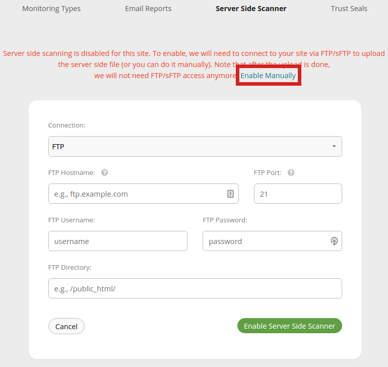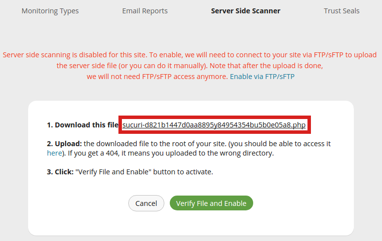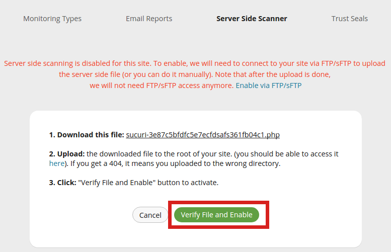 Setup the Server Side Scanner in Sucuri Updated on March 20, 2023 by InMotion Hosting Contributor 2 Minutes, 33 Seconds to Read In this tutorial we will show you how to set up the Sucuri Server Side Scanner. There are two ways to enable this scanner. We will show you how to enable with FTP settings, and also manually via cPanel. “This scan is an extension to our remote malware/blacklist scan and it runs once a day. It verifies every single file on your site, looking for backdoors, phishing and any other security issue that our remote scanner could miss. It also tracks file changes, giving you an audit trail of any change that happens on your files.You can enable Server Side Scanning for no extra cost. It is not required, but we recommend all our users to enable it whenever possible (learn more).“ Enable via FTP Enable Manually Enable via FTP This first option will require you to enter the FTP settings for your server on the Sucuri website, so the account can add the files to enable server side scanning. View and save your FTP settings. Log into Sucuri. You will then see the websites you have already added. Click the drop-down menu, then click the Settings link. Click the Server Side Scanner link. You will then be on the FTP Connection page. Fill in the fields as needed. Below is an example of the settings: Setting Example Connection Choose FTP. FTP Hostname example.com FTP Port 21 FTP Username userna998 FTP Password Enter your FTP Password. If you do not know it, you can reset your FTP password in cPanel. FTP Directory Enter the document root for your website here. Typically: /public_html/ Click the Enable Server Side Scanner button.You will then see a message stating “Server Side Scanner is activated.” Enable Manually If you want to download the file and upload it yourself, this can be accomplished using cPanel or a third party FTP program. For this example, we will be using the File Manager in cPanel. Log into Sucuri. You will then see the websites you have already added. Click the drop-down menu, then click the Settings link. Click the Server Side Scanner link. You will see a message stating “Server side scanning is disabled for this site. To enable, we will need to connect to your site via FTP/sFTP to upload the server side file (or you can do it manually). Note that after the upload is done, we will not need FTP/sFTP access anymore. Enable Manually.” Click the Enable Manually link. Download the file listed in Step 1 (see the screenshot). In another tab, log into cPanel. Click the File Manager link in the Files section. Navigate to the document root for your website. In my tests it is the “/public_html” folder. Click the Upload link on the top of the page. Drag and drop the file you downloaded, or click the Select File button and choose the file. After the file is uploaded, go back to your Sucuri tab and click the Verify File and Enable button. Congratulations, now you know how to setup the Server Site Scanner in Sucuri! Share this Article IC InMotion Hosting Contributor Content Writer InMotion Hosting contributors are highly knowledgeable individuals who create relevant content on new trends and troubleshooting techniques to help you achieve your online goals! More Articles by InMotion Hosting Related Articles How To Open a Port in UFW Resetting the cPanel Password in WHM How to Change your root Password in WHM How to Stop and Disable Firewalld Content Security Policy (CSP) Headers – Complete Reference Guide Why You Need To Keep Your Website’s PHP Version Up-to-Date Learning About Mod_security and Disabling Mod_security Close Open Ports for PCI Compliance How to Pass PCI Compliance Scans DDoS Protection Using Corero