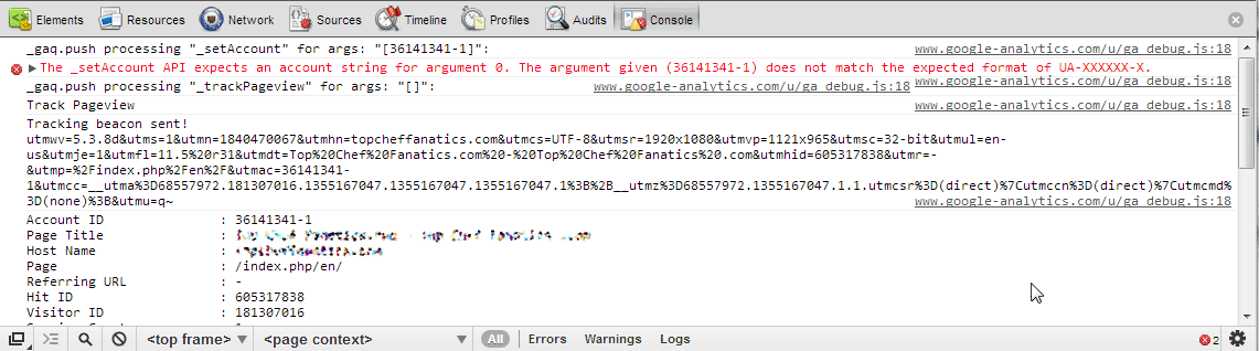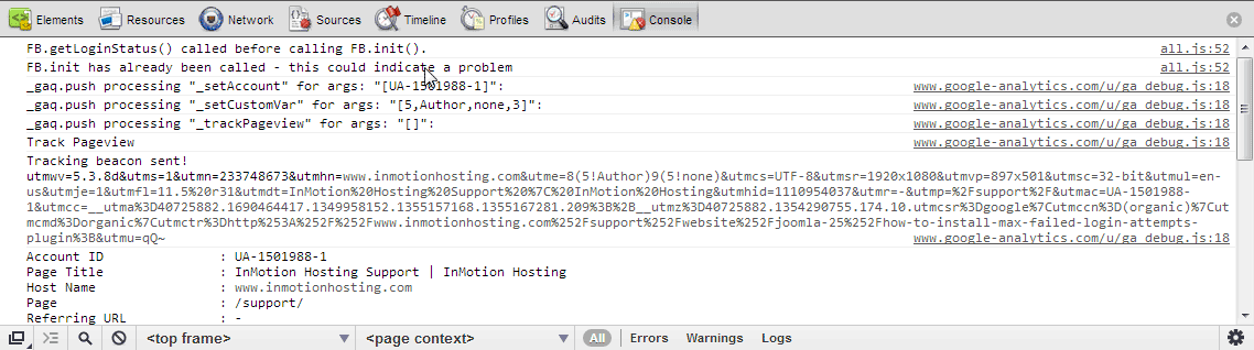 Debug Google Analytics with Google Analytics Debugger Updated on May 11, 2023 by InMotion Hosting Contributor 1 Minutes, 32 Seconds to Read When using Google analytics, it’s easy to find out if you have the tracking code installed, but that doesn’t mean that it is working. Even if Google reports the tracking code has been detected and installed, you may have syntax errors that can cause problems. To properly check your Google Analytic tracking code, you should first ensure it is installed, and then ensure there are no errors within the tracking code iteslf. In this tutorial, we will walk you through these steps. Ensure your tracking code is installed To check if your tracking code is installed, please see Google’s official documentation here. When the tracking code is found to be installed, you will see a message similar to the following: Not Installed Installed Checking your tracking code for errors The Google Chrome browser has an addon that is available that will check and debug the Google Analytics code for any errors. The following tutorial will explain how to use the Google Analytics Debugger. Visit the Google Chrome store for Google Analytics Debugger Click the Available on Chrome button on the top right. Once installed the button will say Added to Chrome. Next, Click the GA Debugging icon at the top right to turn the Google Analytics Debugger On. GA Debugger off GA Debugger On Visit the your site to view the Google Analytics process. When the debugger runs, any error will show in red. In this case the following error is thrown: The _setAccount API expects an account string for argument 0. The argument given (36141341-1) does not match the expected format of UA-XXXXXX-X. This error is caused by the Google Analytics code not being set to the correct account format. Analytics Error No Analytics Error If you see the above error or one similar, visit this page for a comprehensive list of possible problems and how to correct them. Share this Article Related Articles How to Google Analytics to WordPress Without a Plugin Secure Matomo Analytics With The Security Info Plugin How to Migrate to Google Analytics 4 From UA How to Include Google Analytics Tracking Code with PHP Enabling Google Analytics in Koken Adding Google Analytics to Ghost Debug Google Analytics with Google Analytics Debugger How to use Google Analytics with PHP-Nuke Adding Google Analytics to a Container in Google Tag Manager Installing Google Analytics on Your Website