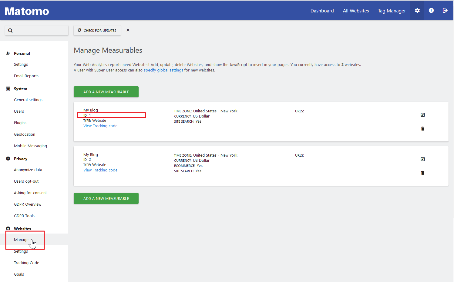 Where’s My Matomo Analytics Site ID? Updated on August 16, 2021 by InMotion Hosting Contributor 0 Minutes, 23 Seconds to Read Unless you’re using the manual tracking code from Matomo, you’re likely going to need the Site ID to integrate Matomo Analytics within your content management system (CMS) – WordPress, thirty bees, Grav, etc.. Below we cover how to find your site ID in Matomo Analytics. Find your Site ID Log into Matomo. Select the Administration gear icon in the upper right beside Tag Manager. Under Websites, select Manage.The Site ID is listed under the site name. Share this Article InMotion Hosting Contributor Content Writer InMotion Hosting contributors are highly knowledgeable individuals who create relevant content on new trends and troubleshooting techniques to help you achieve your online goals! More Articles by InMotion Hosting Related Articles How to Google Analytics to WordPress Without a Plugin Secure Matomo Analytics With The Security Info Plugin How to Migrate to Google Analytics 4 From UA How to Include Google Analytics Tracking Code with PHP Enabling Google Analytics in Koken Adding Google Analytics to Ghost Debug Google Analytics with Google Analytics Debugger How to use Google Analytics with PHP-Nuke Adding Google Analytics to a Container in Google Tag Manager Installing Google Analytics on Your Website