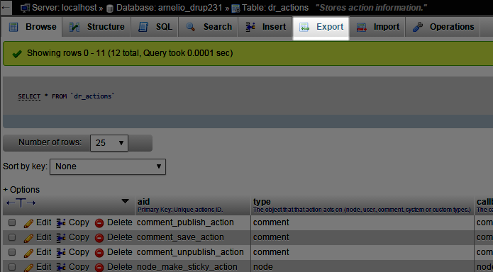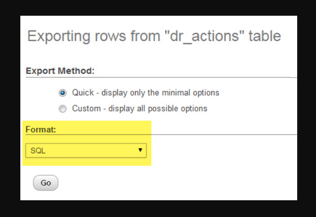 How to Export a Table in phpMyAdmin Updated on December 9, 2025 by InMotion Hosting Contributor 3 Minutes, 0 Seconds to Read phpMyAdmin is a powerful MySQL database client that has many capabilities. We will be showing one of its features – the export table option. Exporting a table means that you will make a copy of the table structures and its data. Caution should be taken whenever working with your database. Make sure that you make a current backup of your database before making any changes. If you are exporting a table, you will be limited to 50 MB. Tables larger than 50 MB will require that you submit a ticket to technical support. How to Export a MySQL Database Table Login to the cPanel In the databases section, click on the icon labeled phpMyAdmin. This will launch the application and you will see the interface open with the list of databases that it can access listed on the left side. Click on the plus sign (‘+’) next to the user name that appears in the column at left. This will expand the database list. Next, click on the plus sign (‘+’) next to the database that contains the table the you wish to export. Click on the table name that you want to export. In the top right of the phpMyAdmin interface, you should see a row of options starting with Browse. Click on Export in order to begin the export process. In order to quickly export all of the data and the entire table structure, leave the Quick option selected. If you intend to be more selective, you would need to click on Custom in order to make changes to what will be exported. For the purposes of this tutorial, we will be exporting all of the table data, so please leave the option set to Quick. The format of the exported file will be left as SQL. This can be changed by clicking on the drop-down arrow. However, to keep things simple, we are going to be using the default format of .SQL. Click on Go in order to start the export. Depending on the size of the table, it may take some time for the export to occur. Also, your web browser will determine how the file will be handled and/or saved. For example, if the Downloads folder has been set in Firefox, then the exported file will be sent into that location. Other browsers may prompt you and ask for the location where the file should be saved. When the export completes, you will see the name of the file. Here’s an example of the text that you may see: -- phpMyAdmin SQL Dump -- version 4.1.8 -- https://www.phpmyadmin.net -- -- Host: localhost -- Generation Time: Oct 21, 2014 at 10:12 AM -- Server version: 5.6.17-log -- PHP Version: 5.4.23 SET SQL_MODE = "NO_AUTO_VALUE_ON_ZERO"; SET time_zone = "+00:00"; -- Table structure for table `ps_access` -- CREATE TABLE IF NOT EXISTS `ps_access` ( `id_profile` int(10) unsigned NOT NULL, `id_tab` int(10) unsigned NOT NULL, `view` int(11) NOT NULL, `add` int(11) NOT NULL, `edit` int(11) NOT NULL, `delete` int(11) NOT NULL, PRIMARY KEY (`id_profile`,`id_tab`) ) ENGINE=InnoDB DEFAULT CHARSET=utf8; INSERT INTO `ps_access` (`id_profile`, `id_tab`, `view`, `add`, `edit`, `delete`) VALUES (1, 0, 1, 1, 1, 1), (1, 1, 1, 1, 1, 1), (1, 2, 0, 0, 0, 0), (1, 3, 0, 0, 0, 0), (1, 4, 0, 0, 0, 0), (1, 5, 1, 1, 1, 1), (1, 6, 0, 0, 0, 0), (1, 7, 1, 1, 1, 1), (1, 8, 0, 0, 0, 0), (1, 9, 1, 1, 1, 1), The file that is exported in SQL format is actually a text file and you can open it to see its contents. If you need to find anything in particular, use your favorite text editor and use the search options to find the text/data that you require. Exported tables can be imported back into a database. Share this Article InMotion Hosting Contributor Content Writer InMotion Hosting contributors are highly knowledgeable individuals who create relevant content on new trends and troubleshooting techniques to help you achieve your online goals! More Articles by InMotion Hosting Related Articles How To Create a PHP Redirect (301, 302, and Dynamic Redirect Examples) Connect to SFTP for Shared Hosting Accounts Using FileZilla FTP Basics for Dedicated Servers How to Install Jekyll and Launch a New Site How to Host AI-Prompt Generated Websites on Shared Hosting What is your default PHP.ini file? Getting Started Guide: FTP Configuring your site in WS_FTP Schedule Social Media Posts With Buffer FTP Error – 421 Too Many Connections