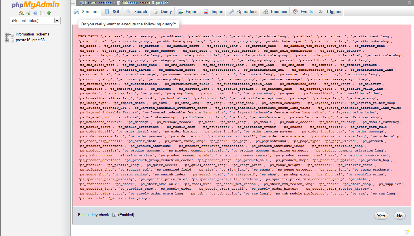 6. You will then be presented with a confirmation screen that displays the SQL Query phpMyAdmin will run. Click on the Yes button to confirm and run the query.