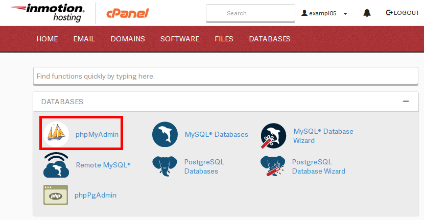 2. From the main cPanel screen, look for the Databases category and then click on the phpMyAdmin tool.