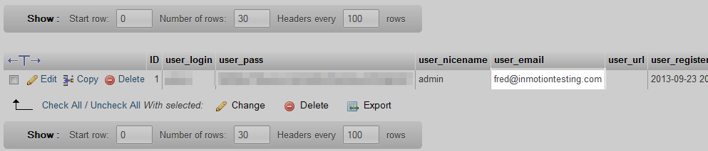 Running MySQL statements in phpMyAdmin Updated on August 16, 2021 by Scott Mitchell 1 Minutes, 17 Seconds to Read When working within your PhpMyAdmin tool, you have the ability to create and run custom MySQL statements. This can be very helpful if you are performing things like a site move or creating a test site and need to change specific site information stored in the database. Follow the instructions below as we demonstrate how to use manual MySQL statements in your PhpMyAdmin tool. Using mySQL statements in phpMyAdmin Log into your cPanel dashboard. Once in the cpanel dashboard, find the Databases category and click on the phpMyAdmin tool. This leads you to the main page. From here, look to the left-hand sidebar and click on the name of the database you want to work with. Here, we selected the database named wp962, which is for a WordPress installation. Next, you want to select the database table you will be working with. From the sidebar menu click on the name of the table you will be creating the statement for. For our example, we chose the wp_users table. Once on the table page, look to the tabs in the upper part of the screen and select the SQL tab. You are brought to an editor screen where you can enter your MySQL statement. Once the statement has been entered, click on the Go button in the lower right corner of the screen to run it. In our example, we simply changed the email address of the admin user. Below you can see that the database now has the new email address in the user_email field. Before After Share this Article Related Articles How To Create a PHP Redirect (301, 302, and Dynamic Redirect Examples) Connect to SFTP for Shared Hosting Accounts Using FileZilla FTP Basics for Dedicated Servers How to Install Jekyll and Launch a New Site How to Host AI-Prompt Generated Websites on Shared Hosting What is your default PHP.ini file? Getting Started Guide: FTP Configuring your site in WS_FTP Schedule Social Media Posts With Buffer FTP Error – 421 Too Many Connections
