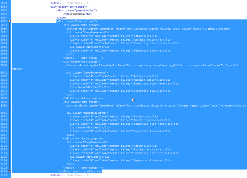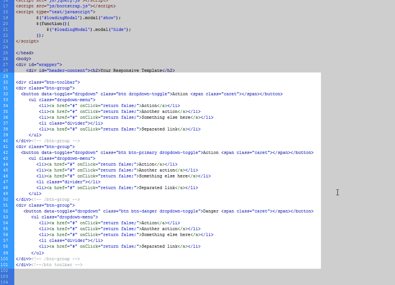 Adding the Bootstrap Menu Buttons to your Responsive Template Updated on August 16, 2021 by InMotion Hosting Contributor 6 Minutes, 0 Seconds to Read Now that you have Bootstrap set up on your Responsive Template, you can use the code provided by Bootstrap to style your site. Bootstrap has a premade set of buttons and menus that you can use in your site. You can see what the look like in the snapshot to the right.In this tutorial, we will add all the buttons to the header of your site. Below are examples of the button function with the InMotion hosting Bootstrap styles. Default Action Another action Something else here Separated link Primary Action Another action Something else here Separated link Danger Action Another action Something else here Separated link Warning Action Another action Something else here Separated link Success Action Another action Something else here Separated link Info Action Another action Something else here Separated link Inverse Action Another action Something else here Separated link Steps to add a Bootstrap Button menu Below is the code for each button type. When stringing multiple buttons together you will need to use the toolbar code below. <div class="btn-toolbar"> --- Button code goes here inbetween the toolbar divs. --- </div> Now you can use the following buttons on your site. Open up the ThemeRoller.htm page and find the button code between lines 6058 to 6129. The Line numbers may vary. Copy the code. The code is broken down below. The Default Button <div class="btn-group"> <button data-toggle="dropdown" class="btn dropdown-toggle">Action <span class="caret"></span></button> <ul class="dropdown-menu"> <li><a href="#" onClick="return false;">Action</a></li> <li><a href="#" onClick="return false;">Another action</a></li> <li><a href="#" onClick="return false;">Something else here</a></li> <li class="divider"></li> <li><a href="#" onClick="return false;">Separated link</a></li> </ul></div><!-- /btn-group --> The Primary Button <div class="btn-group"> <button data-toggle="dropdown" class="btn btn-primary dropdown-toggle">Action <span class="caret"></span></button> <ul class="dropdown-menu"> <li><a href="#" onClick="return false;">Action</a></li> <li><a href="#" onClick="return false;">Another action</a></li> <li><a href="#" onClick="return false;">Something else here</a></li> <li class="divider"></li> <li><a href="#" onClick="return false;">Separated link</a></li> </ul></div><!-- /btn-group --> The Danger Button <div class="btn-group"> <button data-toggle="dropdown" class="btn btn-danger dropdown-toggle">Danger <span class="caret"></span></button> <ul class="dropdown-menu"> <li><a href="#" onClick="return false;">Action</a></li> <li><a href="#" onClick="return false;">Another action</a></li> <li><a href="#" onClick="return false;">Something else here</a></li> <li class="divider"></li> <li><a href="#" onClick="return false;">Separated link</a></li> </ul></div><!-- /btn-group --> The Warning Button <div class="btn-group"> <button data-toggle="dropdown" class="btn btn-warning dropdown-toggle">Warning <span class="caret"></span></button> <ul class="dropdown-menu"> <li><a href="#" onClick="return false;">Action</a></li> <li><a href="#" onClick="return false;">Another action</a></li> <li><a href="#" onClick="return false;">Something else here</a></li> <li class="divider"></li> <li><a href="#" onClick="return false;">Separated link</a></li> </ul></div><!-- /btn-group --> The Success Button <div class="btn-group"> <button data-toggle="dropdown" class="btn btn-success dropdown-toggle">Success <span class="caret"></span></button> <ul class="dropdown-menu"> <li><a href="#" onClick="return false;">Action</a></li> <li><a href="#" onClick="return false;">Another action</a></li> <li><a href="#" onClick="return false;">Something else here</a></li> <li class="divider"></li> <li><a href="#" onClick="return false;">Separated link</a></li> </ul></div><!-- /btn-group --> The Info Button <div class="btn-group"> <button data-toggle="dropdown" class="btn btn-info dropdown-toggle">Info <span class="caret"></span></button> <ul class="dropdown-menu"> <li><a href="#" onClick="return false;">Action</a></li> <li><a href="#" onClick="return false;">Another action</a></li> <li><a href="#" onClick="return false;">Something else here</a></li> <li class="divider"></li> <li><a href="#" onClick="return false;">Separated link</a></li> </ul></div><!-- /btn-group --> The Inverse Button <div class="btn-group"> <button data-toggle="dropdown" class="btn btn-inverse dropdown-toggle">Inverse <span class="caret"></span></button> <ul class="dropdown-menu"> <li><a href="#" onClick="return false;">Action</a></li> <li><a href="#" onClick="return false;">Another action</a></li> <li><a href="#" onClick="return false;">Something else here</a></li> <li class="divider"></li> <li><a href="#" onClick="return false;">Separated link</a></li> </ul></div><!-- /btn-group --> Paste the code into the head section after the header-content H2 tag. It should look like the snapshot to the right. The buttons are different colors If you want a button to use a specific color you can change the buttons class. below are the different button classes for the button menus in Bootstrap. Class name Description btn-inverse Default colors #555 and #222 btn-info Default colors #5bc0de and #2f96b4 btn-success Default colors ##62c462 and #51a351 btn-warning Default colors #fcb44d and #f89406 btn-primary Default colors #c3b100 and #b5cc00 btn-danger Default colors #ee5f5b and #bd362f Share this Article Related Articles How to Align and Float Images with CSS Margin vs Padding Preview Shared Content With Facebook Debugger Accessing Your Website via IP Address The Role of Blocks and Animations in WordPress Is Django supported? Using the Under Construction Page provided by InMotion Hosting Creating an Under Construction or Coming Soon page Beginner Web Design: Guides to HTML and CSS Links to the stylesheets in Responsive Templates